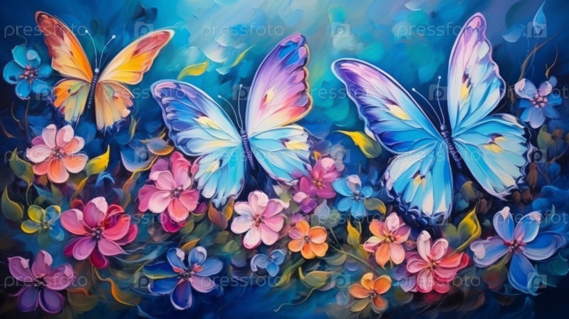 Яркие красочные цветы в розовых и голубых тонах и бабочка с золотым оттенком