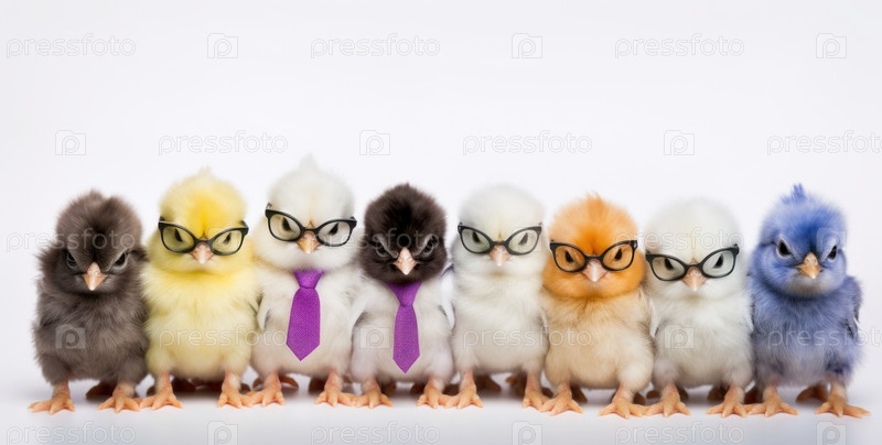 Панорама множества молодых пушистых пасхальных цыплят, стоящих на белом фоне
