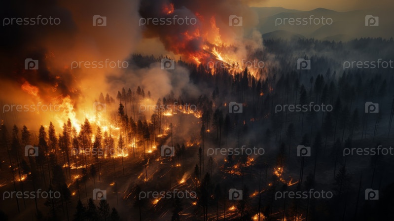 Пожар охватывает лес и сухую траву, оставляя на земле черный слой гари и пепла