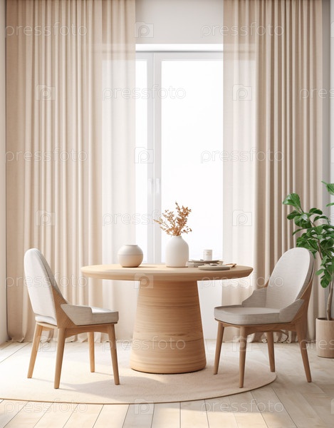 Роскошные апартаменты, комфортабельная гостиная. макет постера, круглый стол и стулья в современной столовой