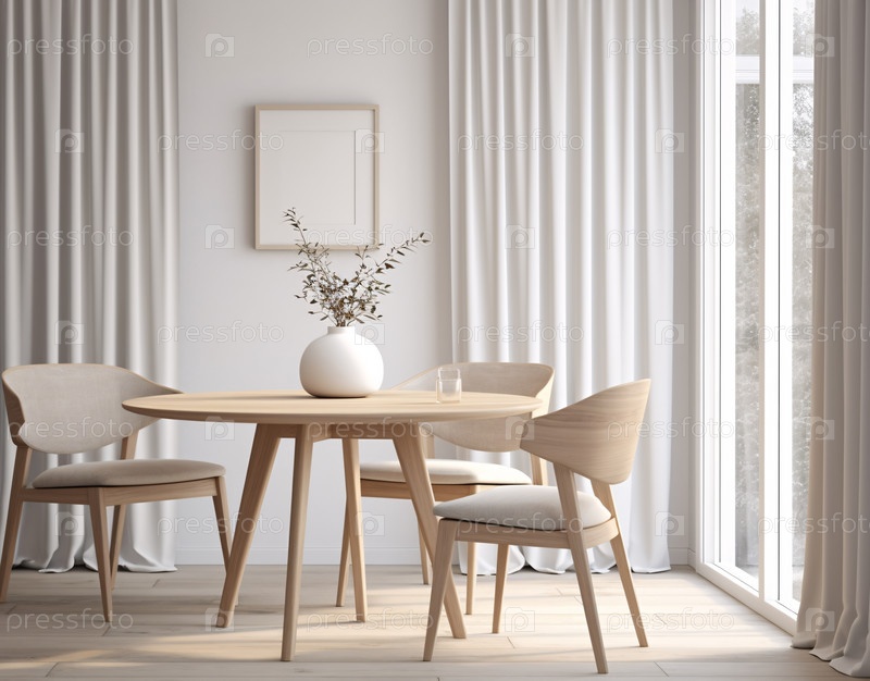 Роскошные апартаменты, комфортабельный люкс, гостиная. Макет постера, круглый стол и стулья в современной столовой