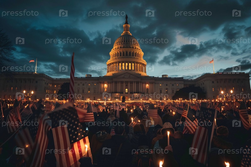 Толпа людей с американскими флагами и факелами собирается перед зданием Капитолия США в сумерках, демонстрируя гражданское единство и патриотизм