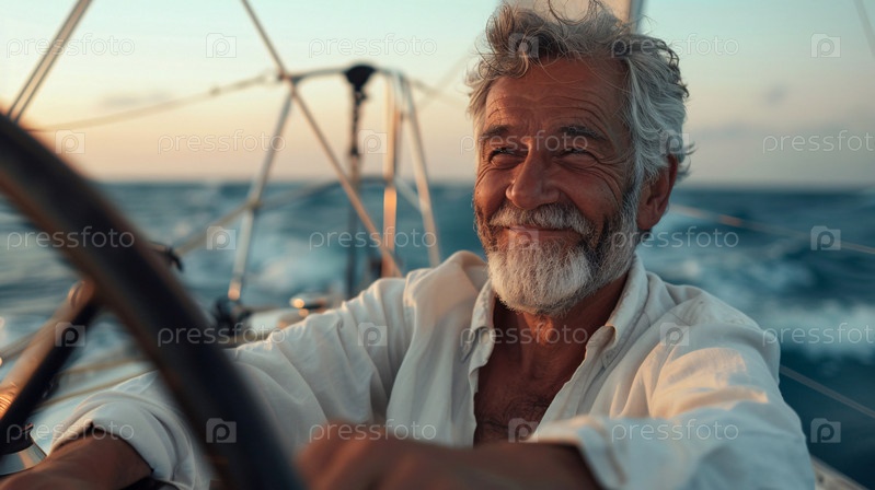 Улыбающийся человек за штурвалом парусника наслаждается солнечным днем в открытом море