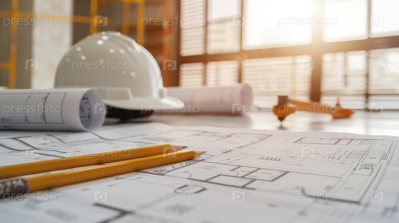 Архитектурное рабочее место с чертежами, карандашами и защитной каской при дневном свете