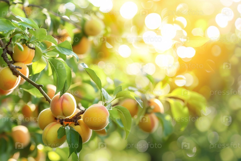 Яркие абрикосы, свисающие с ветки дерева в солнечном свете