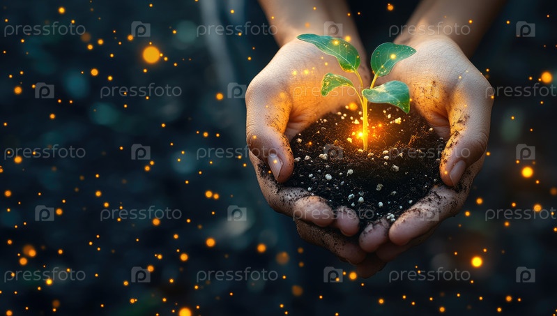 Пара рук нежно держит маленький саженец в почве, символизируя рост и зарождение новой жизни