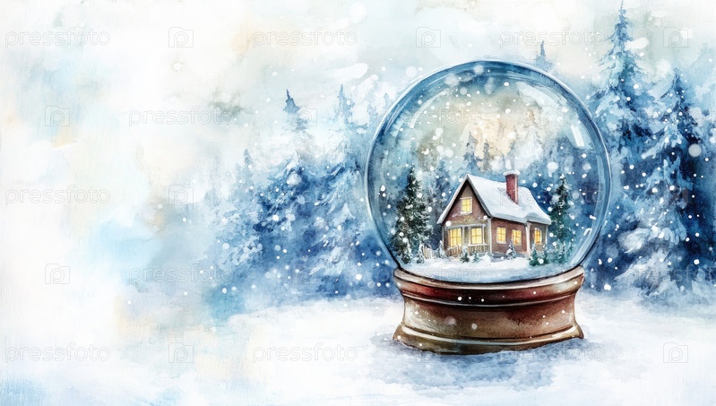 Уютный домик в заснеженном лесу и декоративный снежный шар с рождественской елкой создают волшебную зимнюю картину