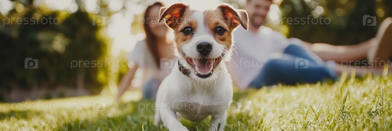 Счастливая собака наслаждается солнечным днем на улице, играя на траве со своими друзьями поблизости, излучая радость и товарищество