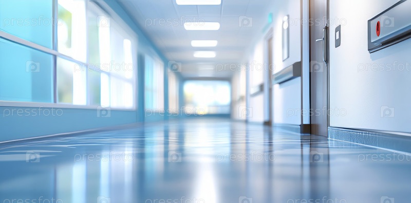 Ярко освещенный, современный больничный коридор с синими полами и пустыми зонами отдыха создает спокойную и стерильную атмосферу