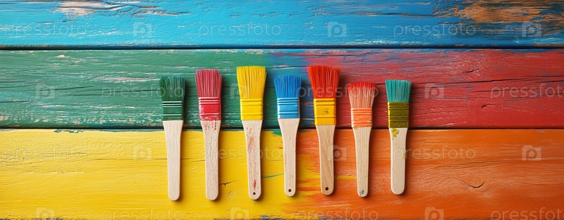 Красочная композиция из кистей на фоне расписных деревянных панелей
