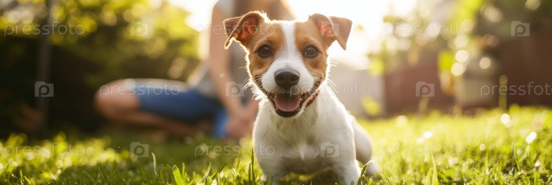 Счастливая собака наслаждается солнечным днем на улице, играя на траве со своими друзьями поблизости, излучая радость и товарищество