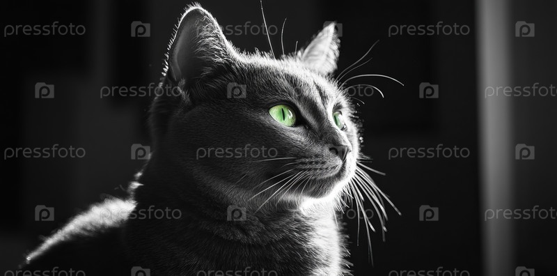 Таинственный черный кот с загадочными зелеными глазами в тени