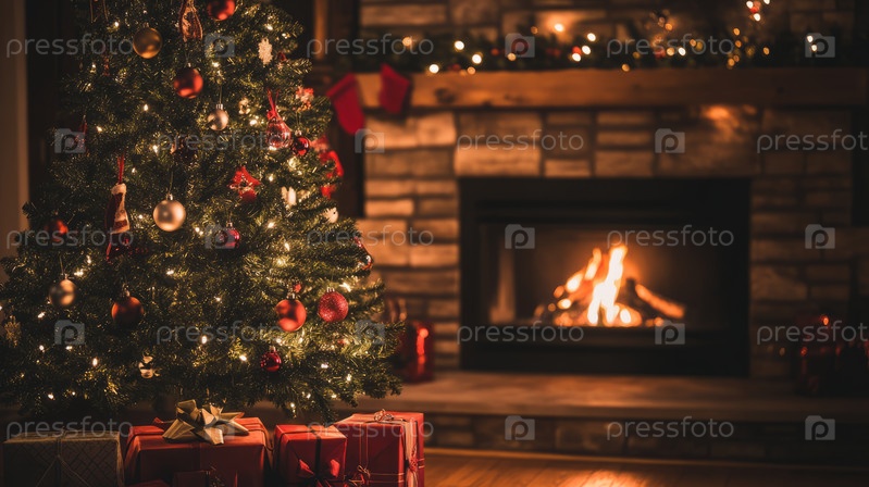 Красиво украшенная рождественская елка с подарками под ней и теплый камин на заднем плане создают праздничную зимнюю атмосферу