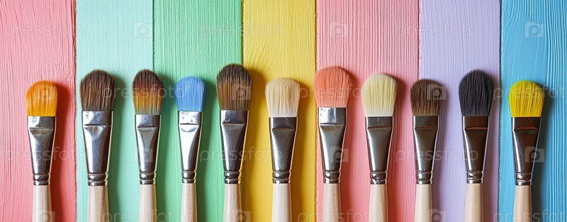 Красочная композиция из кистей на фоне расписных деревянных панелей