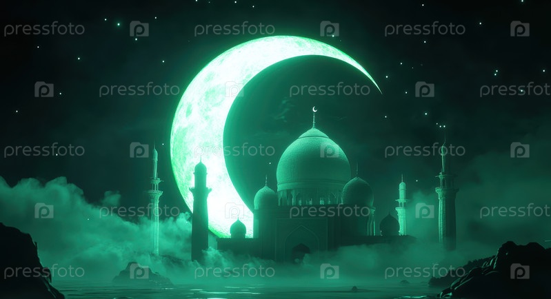 Очаровательная мечеть, залитая лунным светом, с величественным полумесяцем и звездным небом