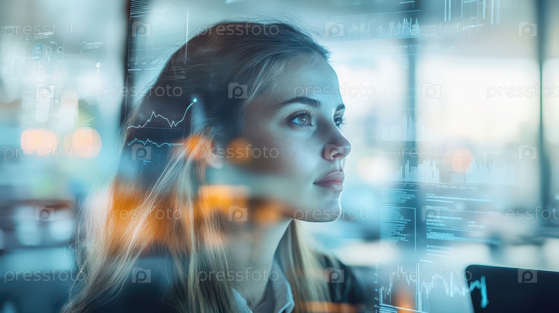 Футуристическая двойная экспозиция, изображающая профиль деловой женщины с цифровыми диаграммами данных и аналитикой, символизирующая технологии, инновации и успех
