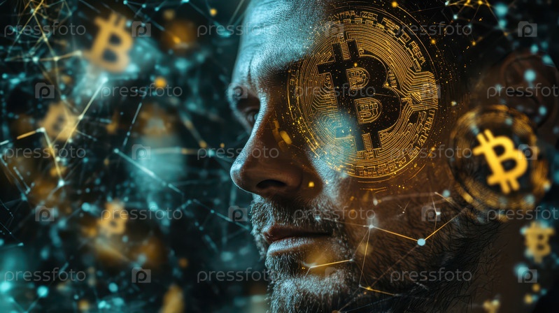 Цифровая двойная экспозиция биткоина и человеческого профиля