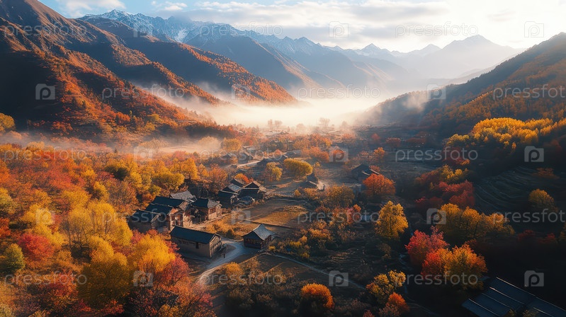 Осенний пейзаж с деревней и горами вдалеке