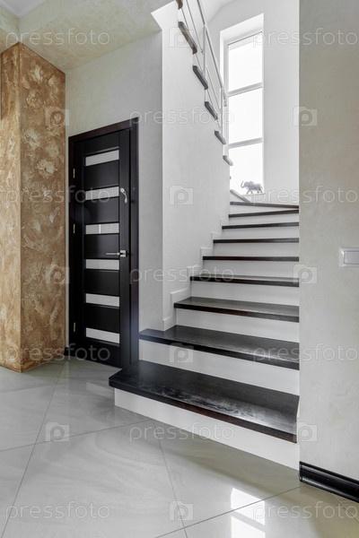 Современная лестница с темными ступенями и белыми стенами