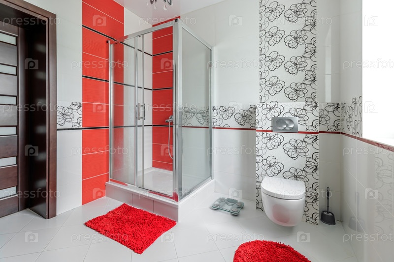 Современная ванная комната с красной и белой плиткой