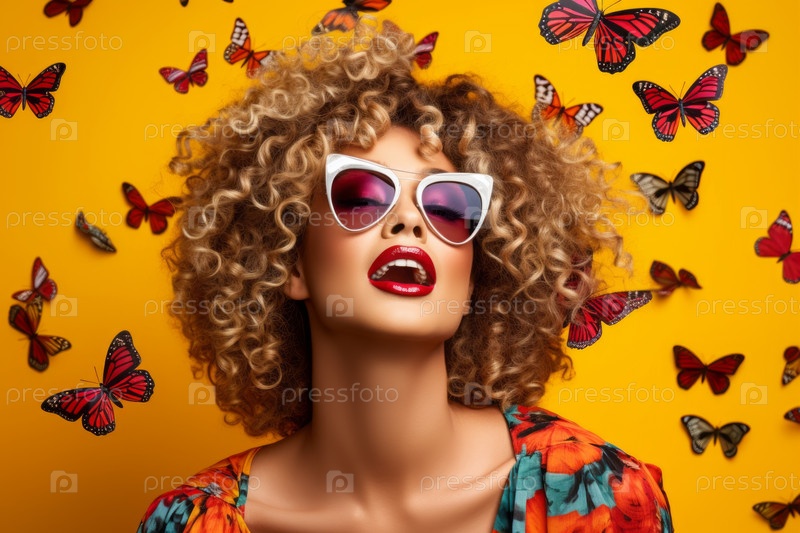 Женский портрет с бабочками в голове. Творческий фон со стильной женщиной. Модный портрет. Летний стиль