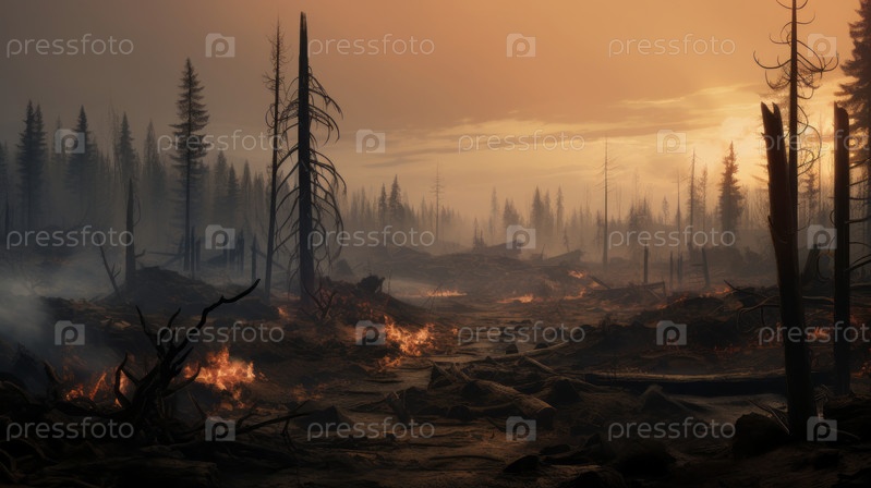 Пожар охватывает лес и сухую траву, оставляя на земле черный слой гари и пепла