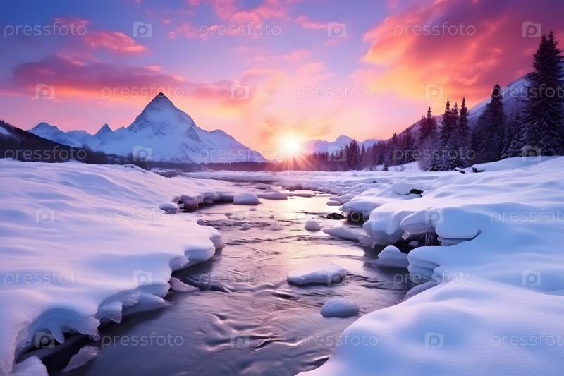 Горы озеро зимний сезон снежный закат пейзаж красивая природа визуальная концепция ai
