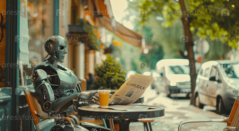 Робот сидит за столиком уличного кафе, читает газету и наслаждается чашкой кофе в спокойной обстановке