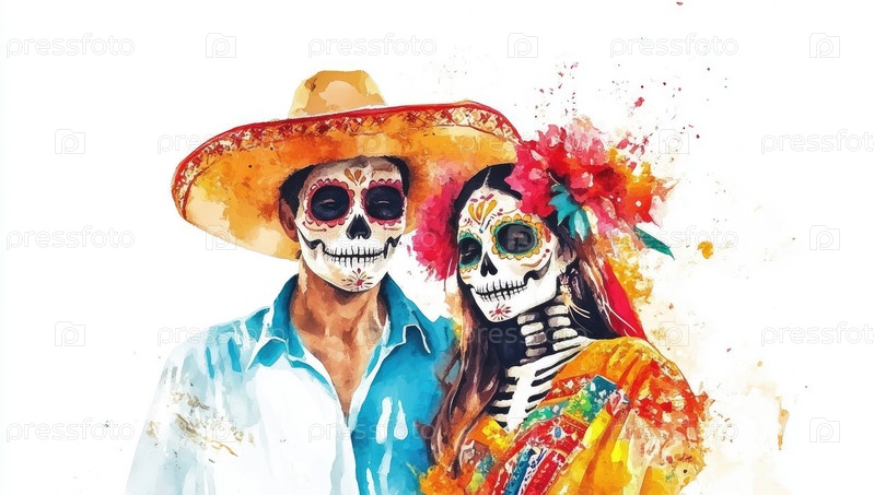 Традиционный мексиканский праздник Дня мертвых, изображенный в ярких акварелях