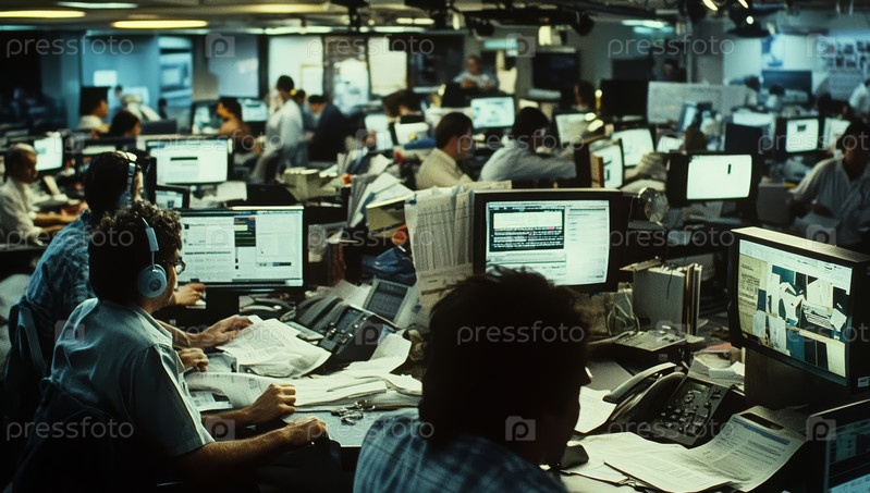 Оживленная офисная обстановка демонстрирует сотрудников, сосредоточенно работающих за своими компьютерами, что создает впечатление динамичного и дружественного рабочего места