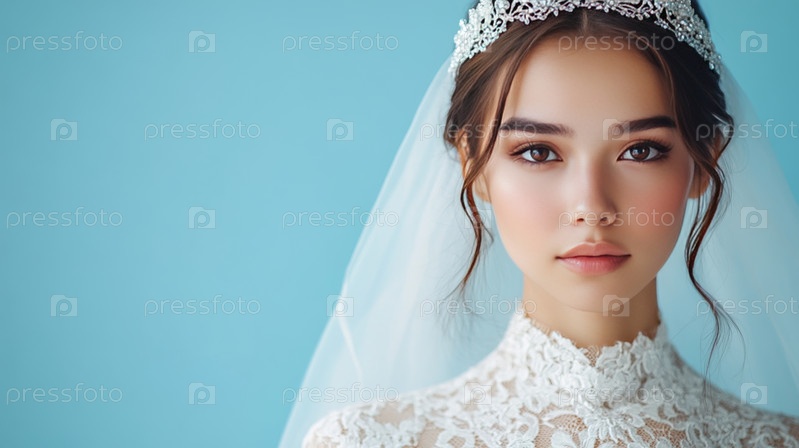 Элегантный свадебный образ с кружевной вуалью и драгоценностями на синем фоне