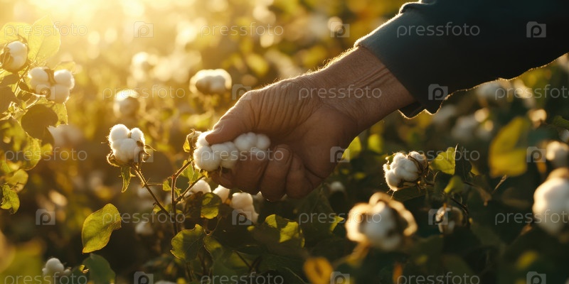 Руки, собирающие хлопок на залитом солнцем поле, запечатлевают изобилие природы