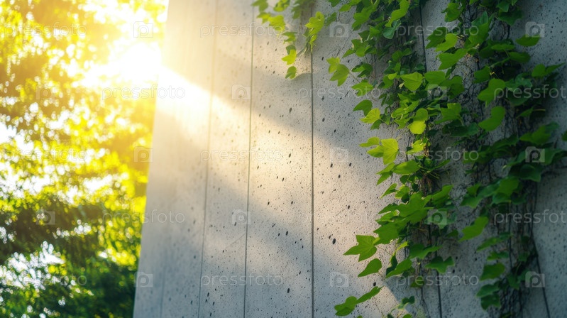 Спокойная зелень, освещенная мягким солнечным светом на бетонной стене