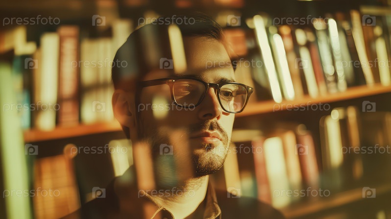 Задумчивый мужчина в очках в отражении библиотеки