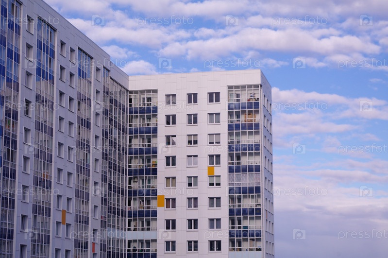 Окна многоквартирного дома на фоне голубого неба. Фасад. Балконы