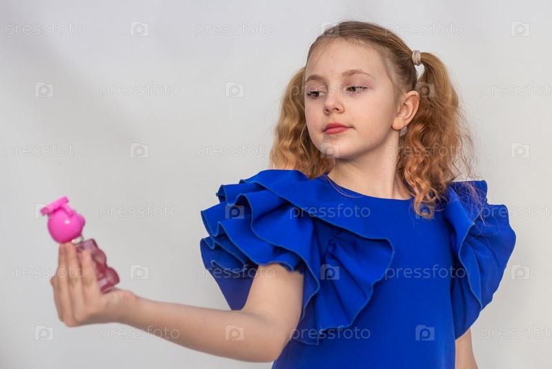 Красивая девочка модель держит в руках детские духи. Портрет. A beautiful model girl holds baby perfume in her hands. Portrait. 2025