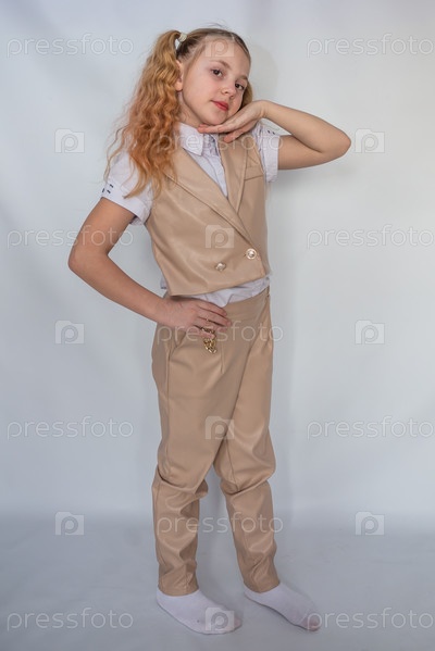 Портрет. Девочка модель в модном кожаном костюме. 2025 год. Portrait. The girl is a model in a fashionable leather suit. 2025