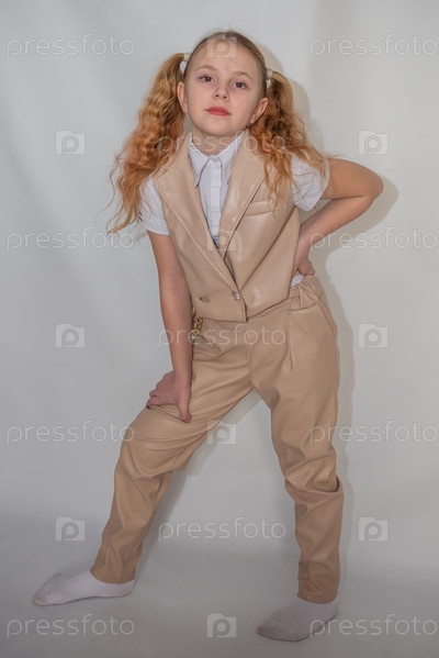 Портрет. Девочка модель в модном кожаном костюме. 2025 год. Portrait. The girl is a model in a fashionable leather suit. 2025