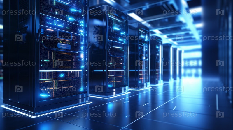 Генеративный коллаж с использованием искусственного интеллекта, изображение, фотография интерьера центра обработки данных с высококачественной защитой серверного хранилища