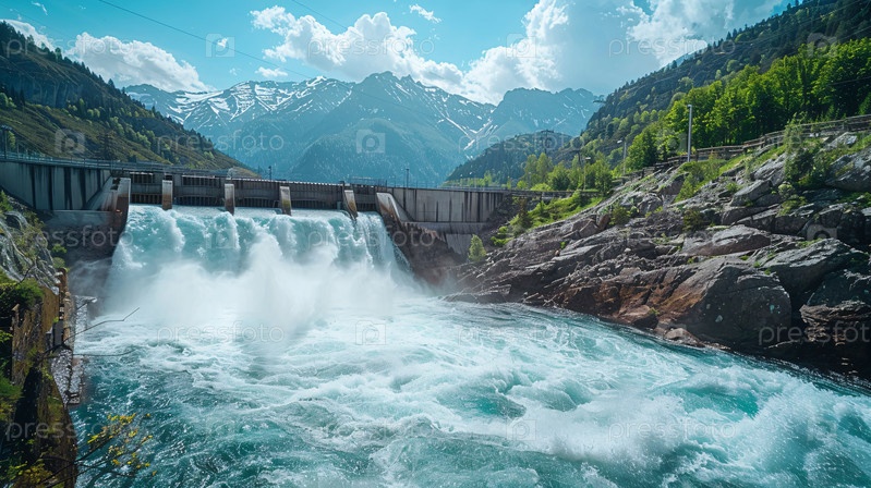 Плотина гидроэлектростанции с горами и рекой