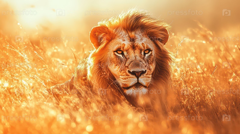 Величественный лев в Золотой Саванне на рассвете