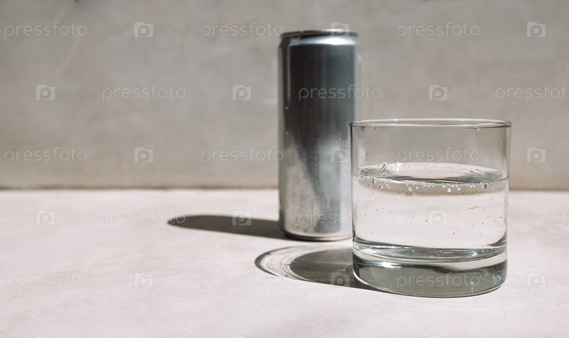Крупный план стакана чистой минеральной воды и макета серебряной жестяной банки. Стакан и банка на гранитном столе. Жесткий солнечный свет