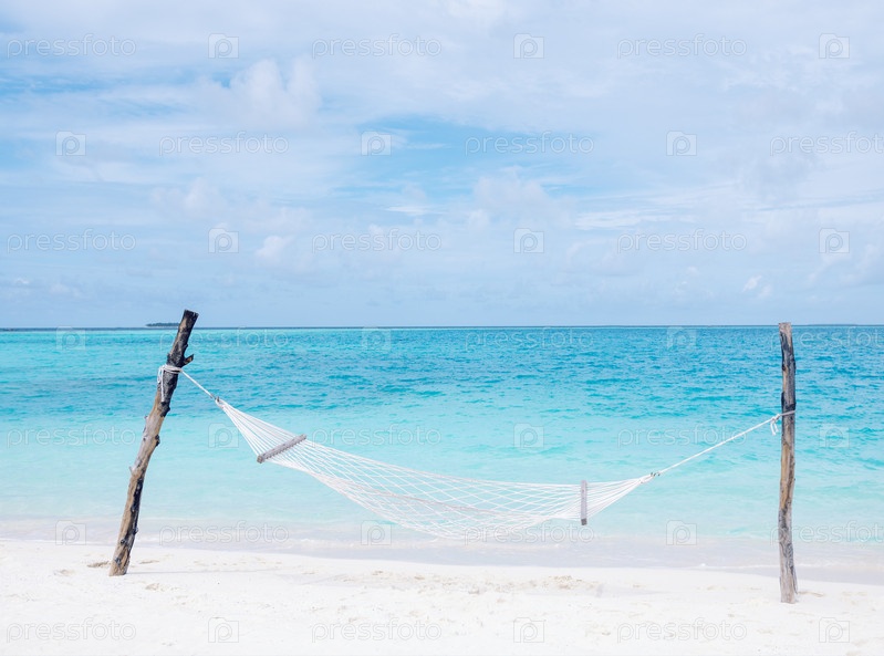 Пустой гамак на берегу океана. Чистый белый пляж и голубая морская вода. Красивый морской пейзаж