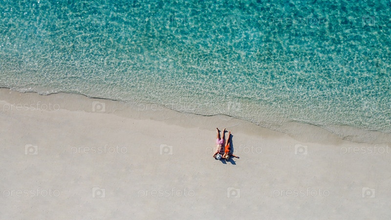 Вид с воздуха на молодую супружескую пару в купальниках, лежащую на берегу океана. Мужчина и женщина в летних шляпах отдыхают на пляже