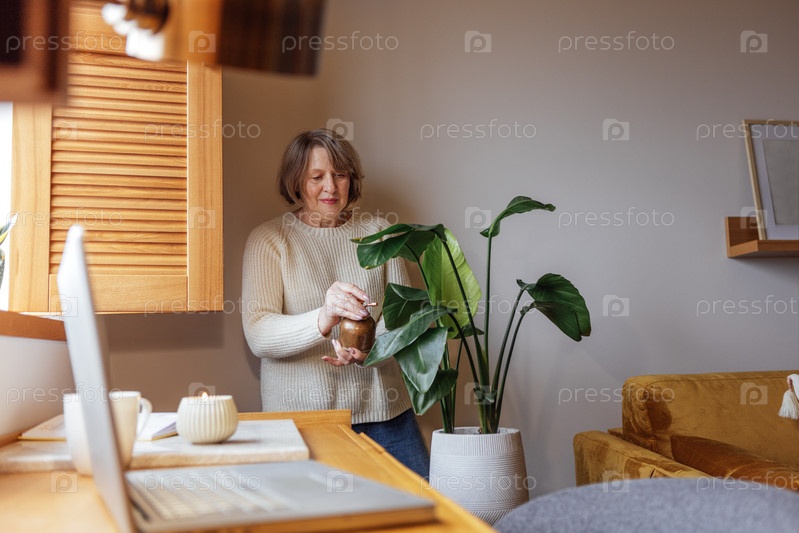 Пожилая женщина в повседневной одежде поливает комнатное растение дома. Зрелая дама ухаживает за цветком в горшке в гостиной