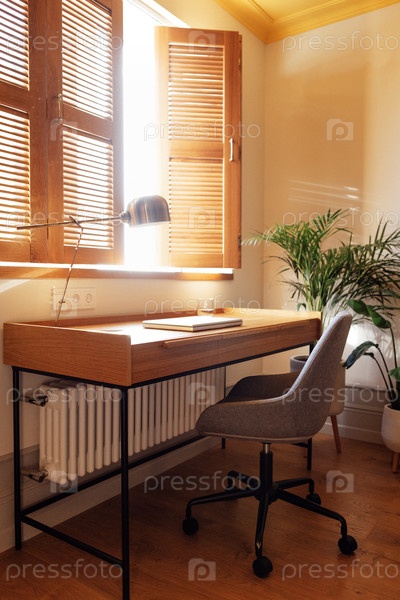 Крупный план домашнего рабочего места с деревянным столом, стильной золотой лампой и ноутбуком. Яркий солнечный свет из открытого окна с жалюзийными ставнями