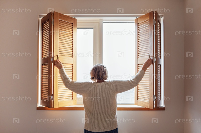 Пожилая женщина в свитере открывает деревянные ставни. Красивая дама средних лет в повседневной одежде
