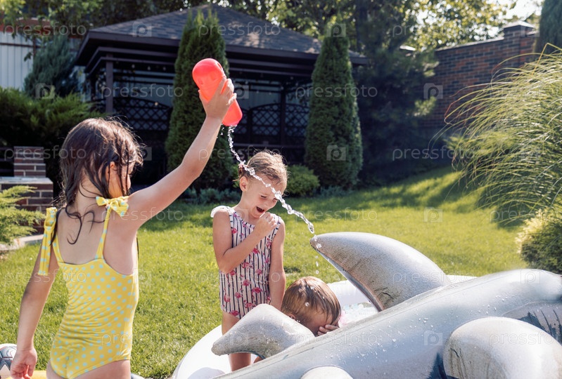 Маленькие дети плещутся и веселятся на заднем дворе дома. Милые девушки в купальниках обливаются водой и смеются