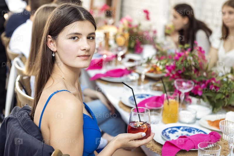Молодая очаровательная девушка в синем платье сидит за праздничным столом и держит бокал. Милый подросток в элегантном костюме пьет коктейль на праздничном ужине
