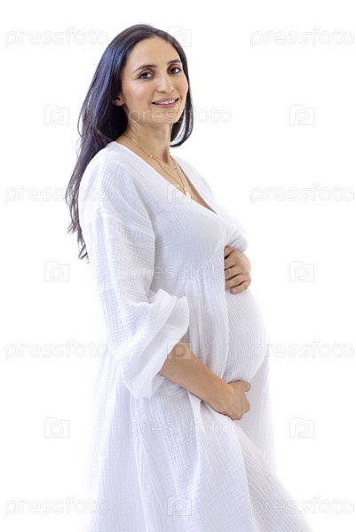 Портрет привлекательной молодой беременной женщины в белом платье. Очаровательная будущая мама нежно держит свой живот. Белый изолированный фон